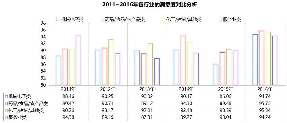 從近六年的滿意度對比來看,2016年機(jī)械電子類、藥品/食品/農(nóng)產(chǎn)品類、化工/建材/其他類的顧客滿意度均達(dá)到最高點(diǎn),值得表揚(yáng),與去年相比,今年的顧客滿意度均有較大幅度的提升,應(yīng)繼續(xù)保持。