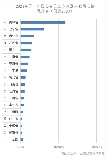 文旅部數(shù)據(jù)顯示,五一假期5天全國國內(nèi)旅游出游2.95億人次,同比增長7.6%。根據(jù)公布數(shù)據(jù),2024年五一期間旅游人數(shù)增長省排名中,吉林、遼寧、內(nèi)蒙、江蘇、黑龍江五省旅游人數(shù)增長排名前五,市排名中,長春、大連、沈陽、哈爾濱、天津排名前五。